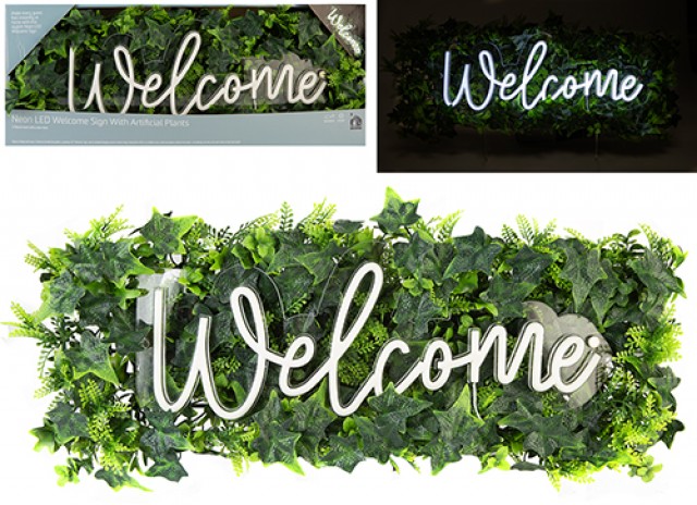 Create an inviting atmosphere with the Manhattan Gift Company Neon Welcome Sign with Artificial Plants. Combining vibrant LED neon lighting and lush faux greenery, this stylish decor piece adds warmth and modern flair to any space. Complete with a 2m USB cable, it's perfect for homes, offices, or retail displays.