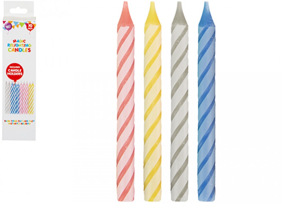 Surprise and delight with the Party Party Collection 10 Magic Relighting Candles with Holders. Blow them out and watch them reignite for endless fun! Complete with sturdy holders, these novelty candles are perfect for birthdays and celebrations. A popular wholesale party essential delivering value, entertainment, and repeat purchase potential.