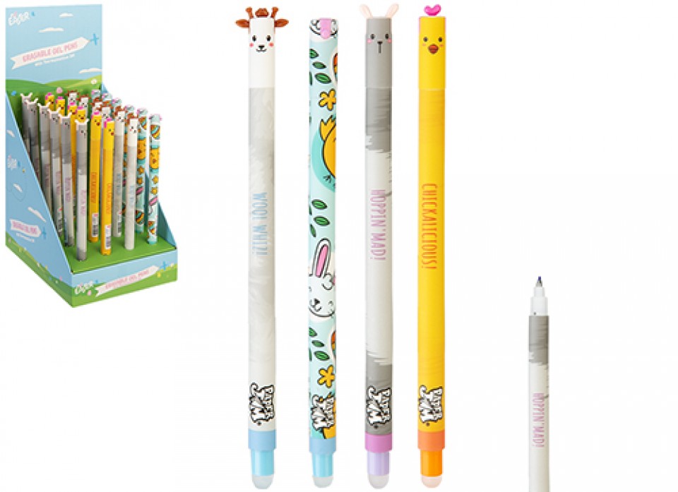 Easter design erasable gel pen 4 assorted offers fun seasonal styling with smooth, erasable ink for mistake-free writing. Featuring vibrant Easter-themed designs, these novelty pens are perfect for schools, gifts, and retail displays. High-demand stationery line ideal for impulse purchases, bulk wholesale buying, and spring promotional ranges and strong sell-through.