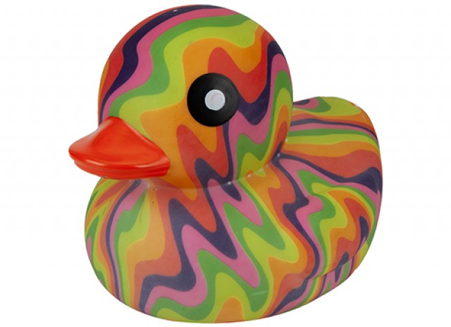 Make a splash with the Rainbow Duck . 20cm. Featuring a bold, multicolour design, this oversized novelty duck is perfect for bath time fun, gifts, or display. Durable and eye-catching, it appeals to kids and collectors alike, offering retailers a playful, high-impact product with excellent wholesale sales potential.