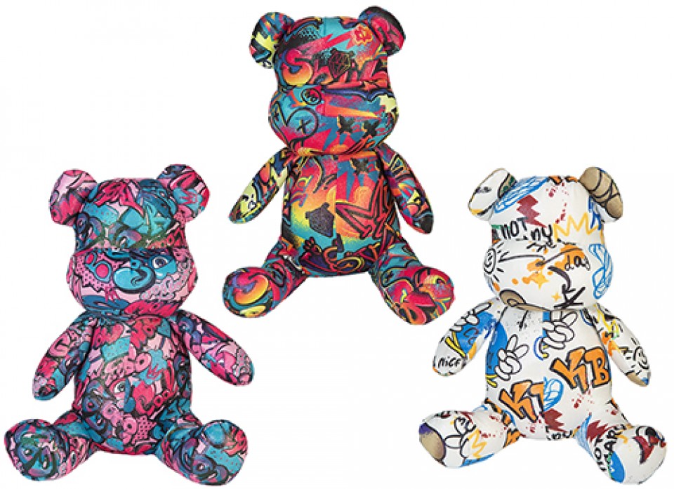 Graffiti Bear with Beans 23cm plush features a bold, street-style design in 3 assorted styles, enhanced with weighted bean filling for added tactile appeal. This eye-catching soft toy is perfect for gift shops and trend-led ranges, driving impulse purchases while offering strong wholesale margins and standout shelf presence.