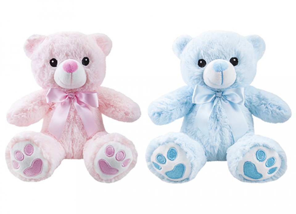 Soft and cute baby bears in pale pink and pale blue with a silk ribbon and embroidered features.