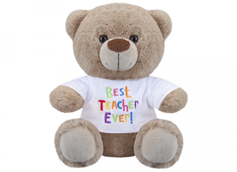Traditional brown bear with white T-shirt. Best Teacher Ever! embroidered detail on T-shirt. Perfect gift for your teacher.