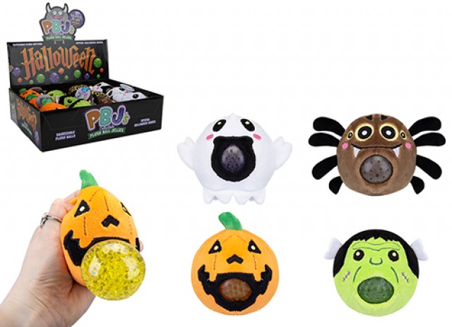 Delight customers with PBJ's Plush Ball Jelly Hal oween edition, 8cm. Featuring 4 assorted spooky designs, these squishy stress-relief plush toys combine soft textures with fun jelly-filled centers. A perfect seasonal impulse buy, collectible, or gift, they bring interactive play and Halloween spirit to retail displays and themed promotions.