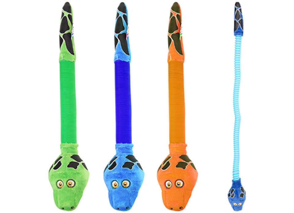 Small snake soft toys with telescopic pop tube body.