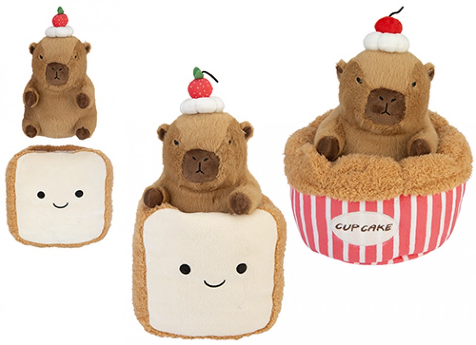 Enhance your plush offering with Capybara Foodie Plush toys, 25cm in size and available in two assorted designs. Featuring the hugely popular capybara trend with fun food-themed details, these soft, high-quality plush toys are perfect for gift shops, toy retailers, and impulse buys, delivering strong sales appeal and excellent margins.