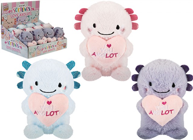 Delight customers with the Oh So Soft Softlings Love You More Axolotl Plush! Featuring 3 assorted designs, each cuddly axolotl holds a love heart, making it perfect for Valentine's Day gifts, retail displays, and impulse buys. Soft, charming, and collectible, these wholesale plush toys drive sales and customer appeal.
