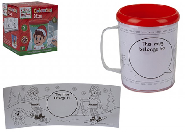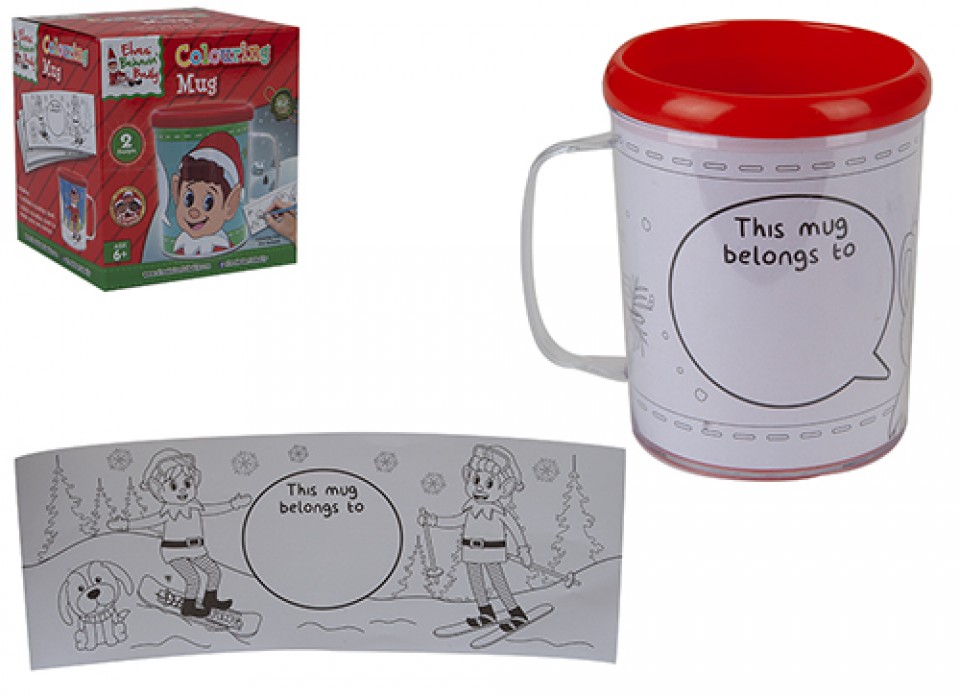Colour your own Elves Behavin Badly cup. Contains plastic mug, 1 printed colouring sheet and 1 plain colouring sheet to create your own design.