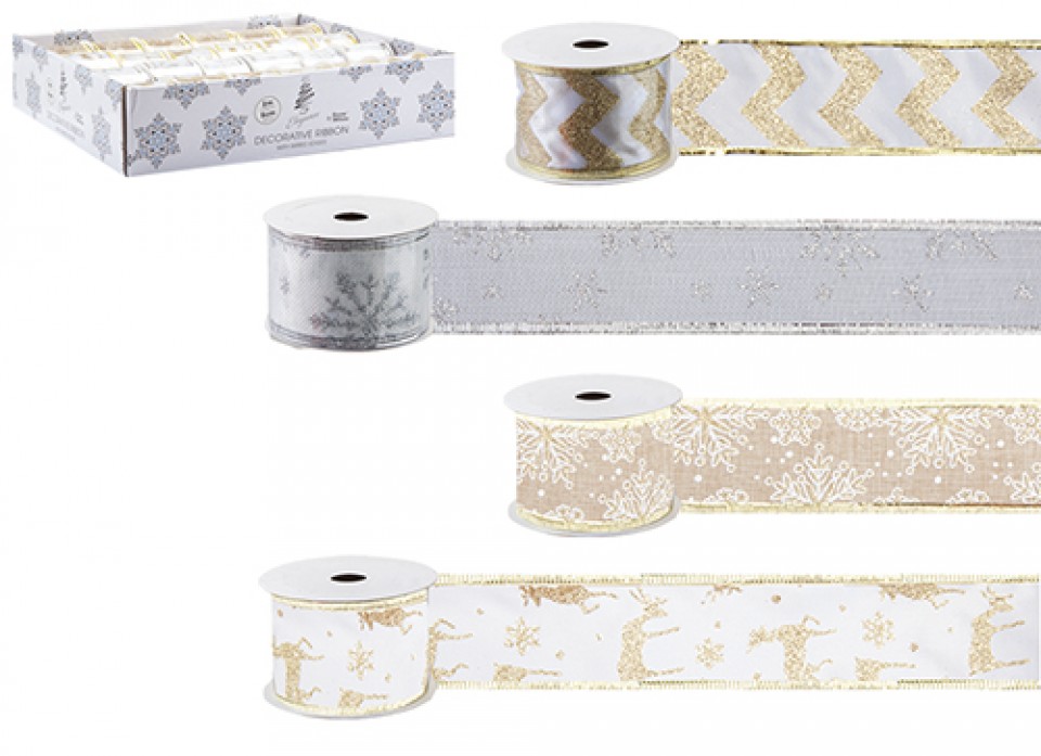 A 5cm wide weaved ribbon with 2m on each reel. Comes in 4 designs, this ribbon benefits from a wired edge which mean that it holds its shape well making it ideal for decoration and crafts.