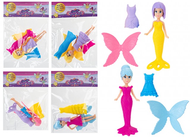 The 4 Assorted Dress Up Mini Fairy Dolls with interchangeable accessories offer endless playtime fun. Each doll features vibrant outfits and wings, allowing kids to mix and match accessories for unique looks.