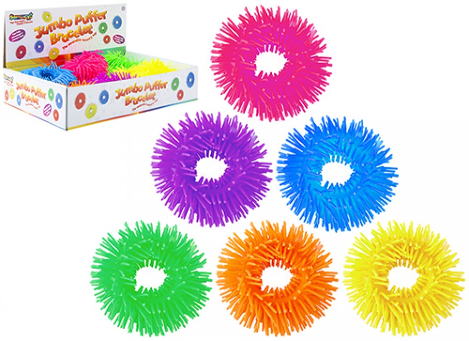 Bright and colourful puffer bracelets. Provides a tactile feeling. Perfect to enhance costumes. Ideal prize or party gift.