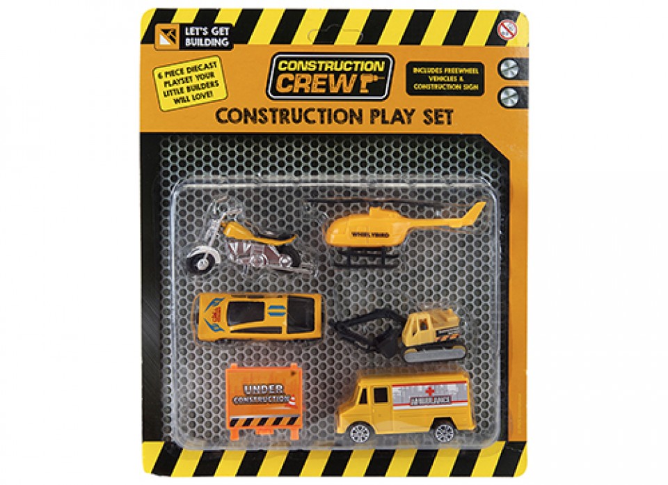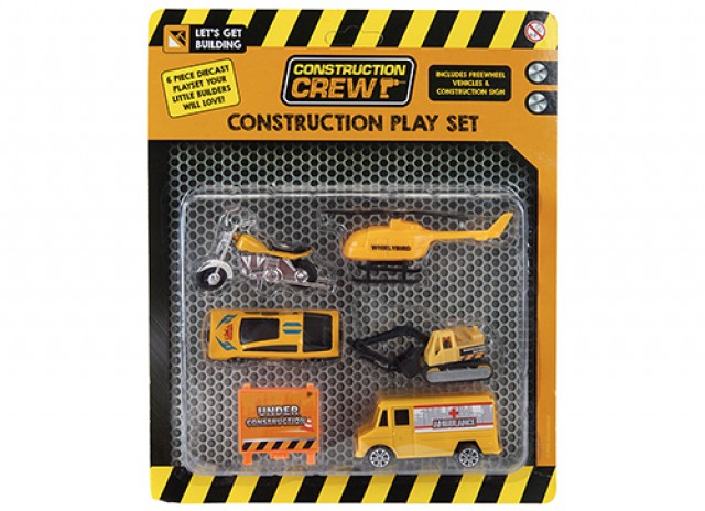The Pack of 6 Die Cast Construction Play Sets features durable, finely detailed construction vehicles, perfect for young builders. These realistic vehicles, including excavators and trucks, encourage imaginative play and motor skills development.