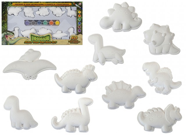 The Paint Your Own Dinosaur Decorations set allows kids to bring their favorite prehistoric creatures to life. This fun craft kit includes 10 dinosaur ornaments, 6 vibrant paints, and 1 brush.