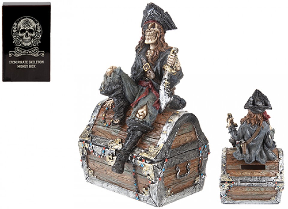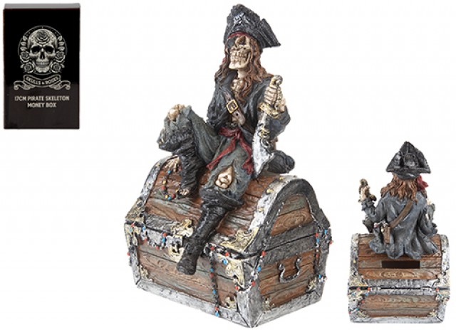 Treasure savings with the 17cm Polyresin Pirate Skeleton Money Box! Featuring intricate detailing and a fun pirate skeleton design, this durable money box is both decorative and practical. Perfect for Halloween, themed d cor, or novelty gifting-an eye-catching addition to gift shops, seasonal ranges, and children's pirate-themed merchandise displays.