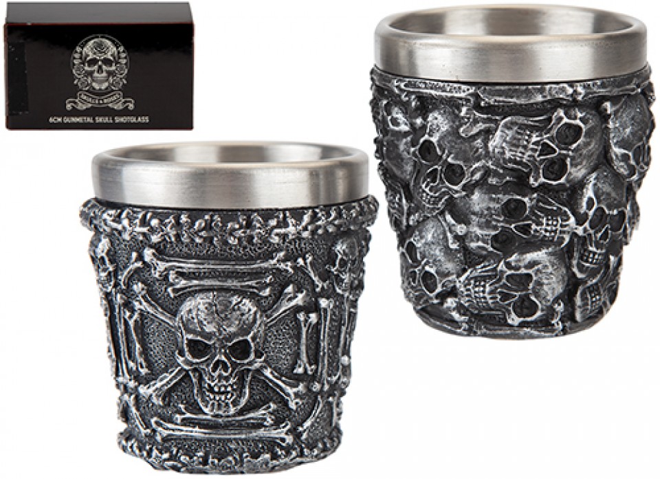 Serve in style with the Pack of 2 6cm Polyresin Gunmetal Skull Shot Glasses! Featuring detailed skull exteriors with a striking gunmetal finish, these gothic-inspired shot glasses are perfect for parties, Halloween, or alternative giftware. A bold addition to novelty drinkware and themed retail displays.