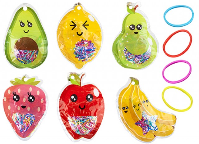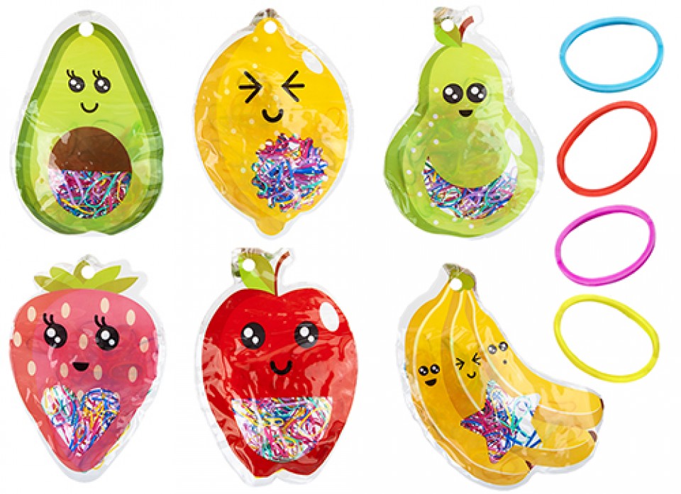 The 6 Assorted Pack of 100 Elastic Hair Bands in Fruit Pouch offers a vibrant variety of stretchy, durable hair bands in assorted colours. Packaged in a fun fruit-themed pouch, this set is perfect for retailers seeking to provide trendy, practical accessories for all hair types.