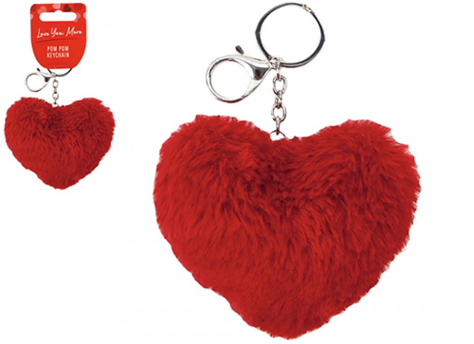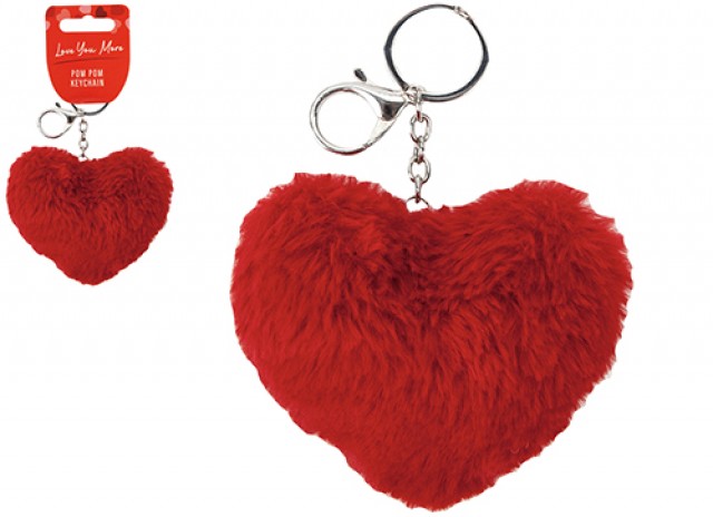 LOVE YOU MORE FAUX FUR HEART SHAPED POM POM KEYCHAIN RED