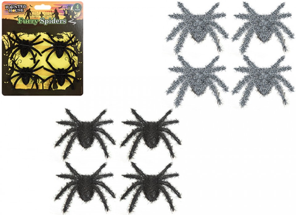 HAUNTED HOUSE FURRY SPIDERS PACK OF 4 2 ASSORTED
