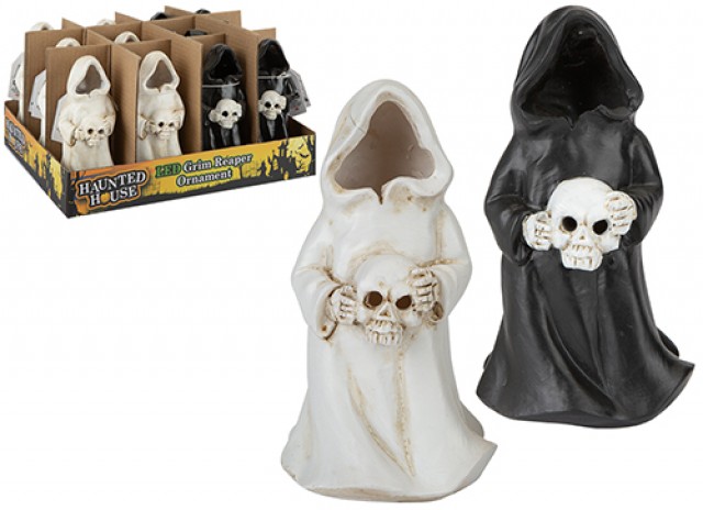 Create an eerie impact with Haunted House 2 Assorted LED Grim Reaper Ornaments. Featuring spooky designs with glowing LEDs, these detailed polyresin figures are perfect for Halloween displays, haunted house decor, and themed gift ranges. Eye-catching and atmospheric, they're an ideal seasonal seller for retail and party decoration stockists.