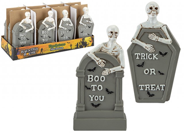 Bring spooky charm to Halloween displays with Haunted House 2 Assorted Tombstone Skeletons featuring fun messages: "Trick or Treat" and "Boo to You." These detailed polyresin ornaments add character to seasonal decor.