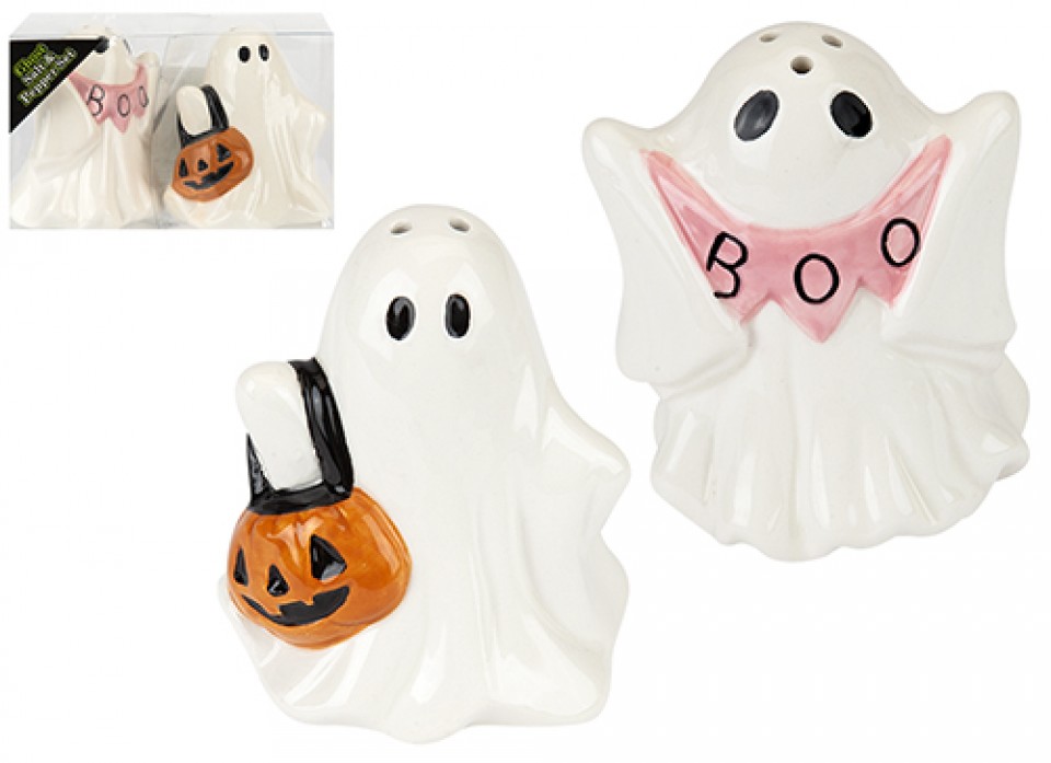 Add fun and function to Halloween dining with the Haunted House Boo Ghost Cruet Set. This ceramic salt and pepper set features two charming ghost characters one with "Boo!" detailing. Ideal for spooky-themed displays, partyware ranges, and seasonal home decor, it's a must-have Halloween novelty for gift and kitchen retailers.