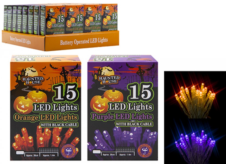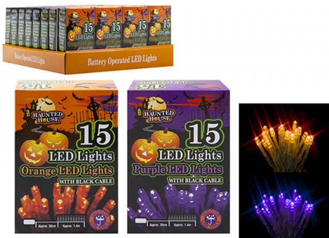 Spooky coloured LED lights. Battery operated in 2 popular Halloween colours. Ideal for decorating during the Halloween season.