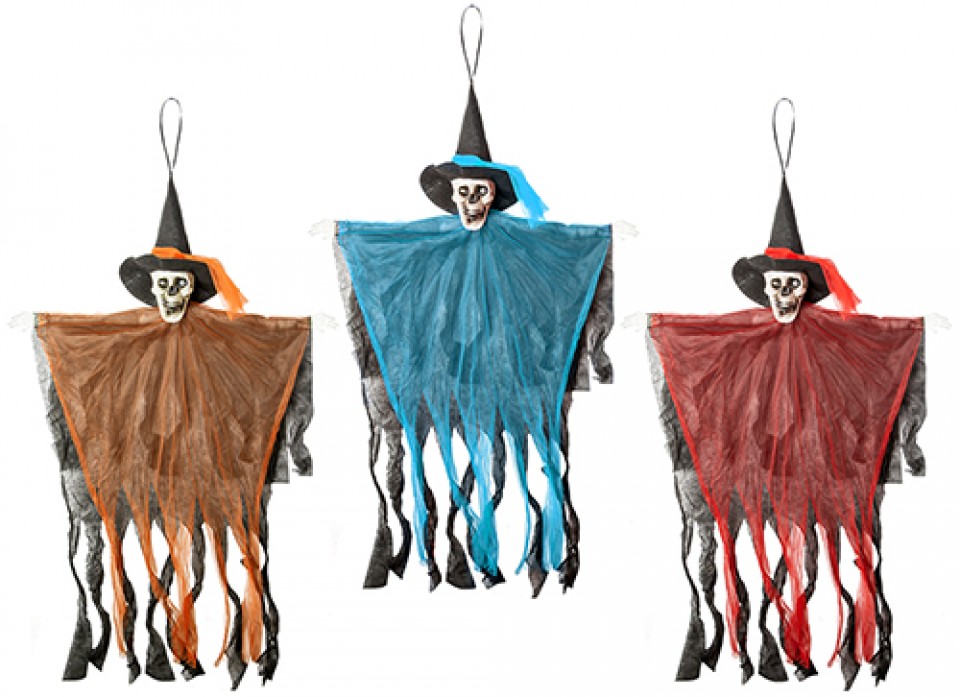 Spooky hanging skeleton decorations. Eyes light up to give a creepy glow.