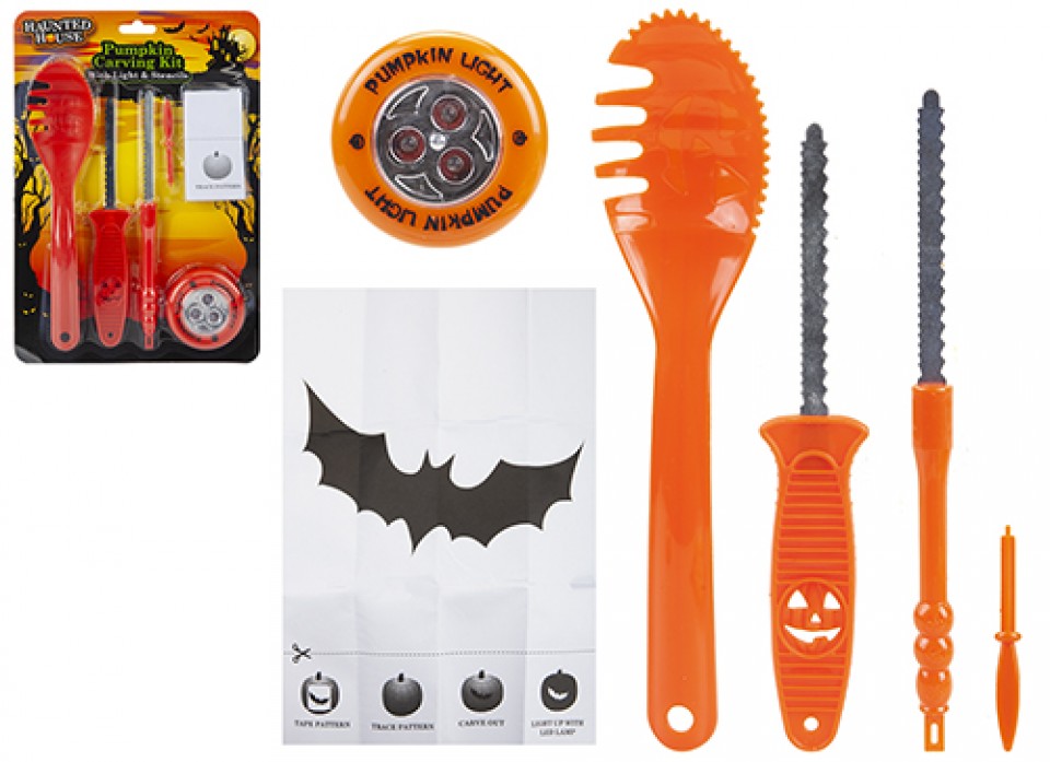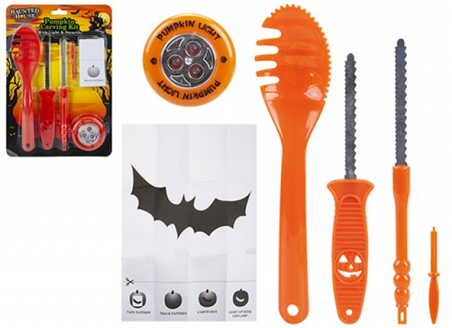 This carving set is a must have accessory of any Halloween party. The set includes a scoop spoon, a pen, light, 2 pumpkin carvers (1 Large & 1 Small) and 9 Pumpkin designs.